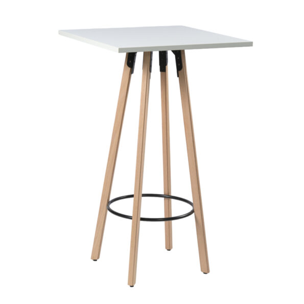 Mit seiner angenehmen Stehhöhe eignet sich dieser Tisch perfekt für Stehzonen, Empfangsbereiche oder Barbereiche. Die rechteckige Form bietet ausreichend Platz für Getränke, Unterlagen oder Dekorationen. Die Kombination aus Holzgestell und weißer Tischplatte sorgt für einen modernen, freundlichen Look.